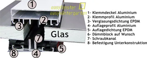 Aluminiumprofile für Glas mit Bezeichnungen und Verwendungsart. Finden Sie das passende Profilsystem für Ihre Terrassenüberdachung. Von VSG Sicherheitsglas bis Dreifachglas